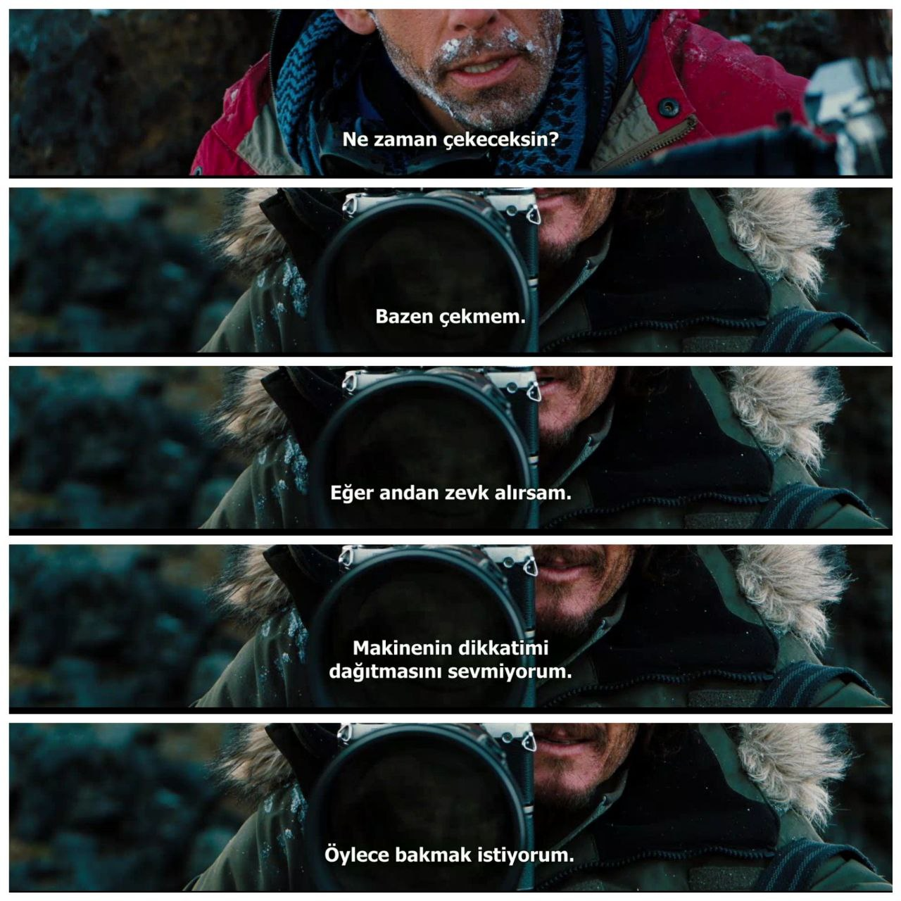 Yazının başında yer alan görselde, 5 küçük cümlede çok şey anlatılır. Kaçırdığımız huzur anlatılır. Anın tadını doyasıya yaşamayı elimizin tersiyle ittiğimiz. Bu sahne, hayran hayran izletir kendini.